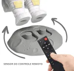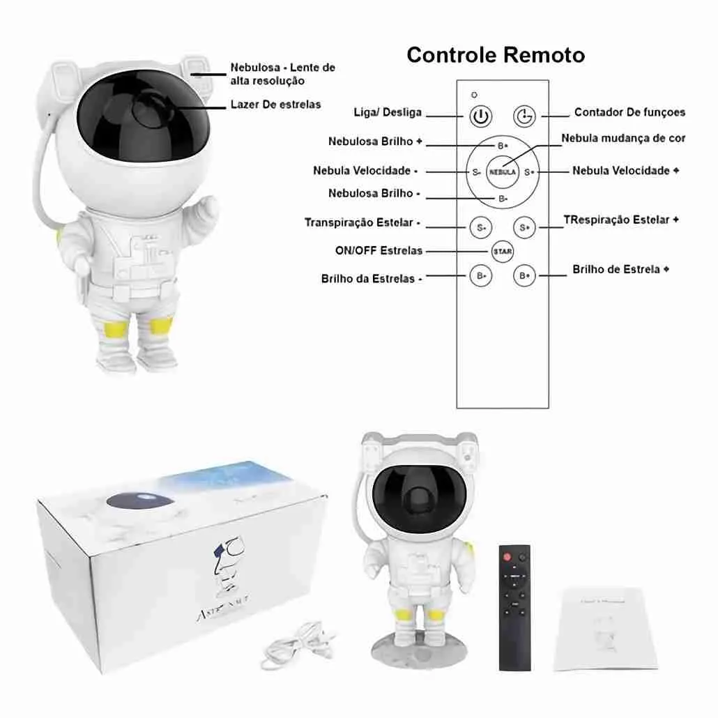 Com um efeito SUPER REALISTA, a luminaria possui um projetor de alta definição capaz de transformar o seu ambiente em uma galaxia nebulosa. Possui diversos efeitos de luz rotativos combinados com um laser para representar as estrelas do universo. Com um design inovador e aparência única serve perfeitamente como um item de decoração. A cabeça do astronauta pode girar 360, podendo assim posicionar o efeito em qualquer teto ou parede. Pode ser controlado pelos botões na parte traseira ou via controle remoto.