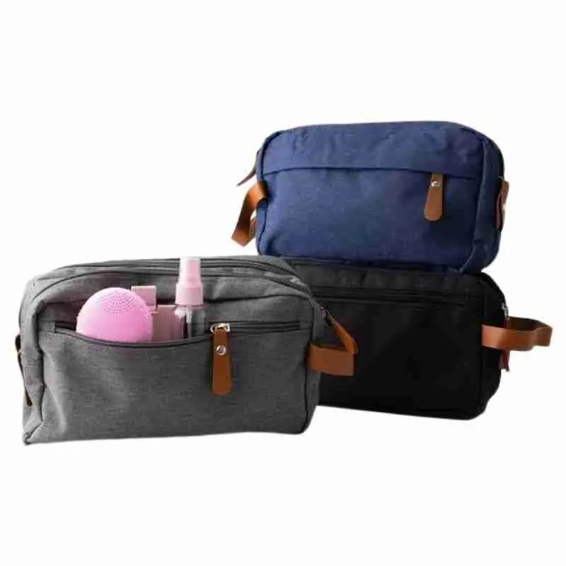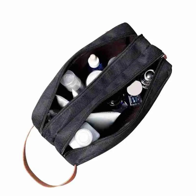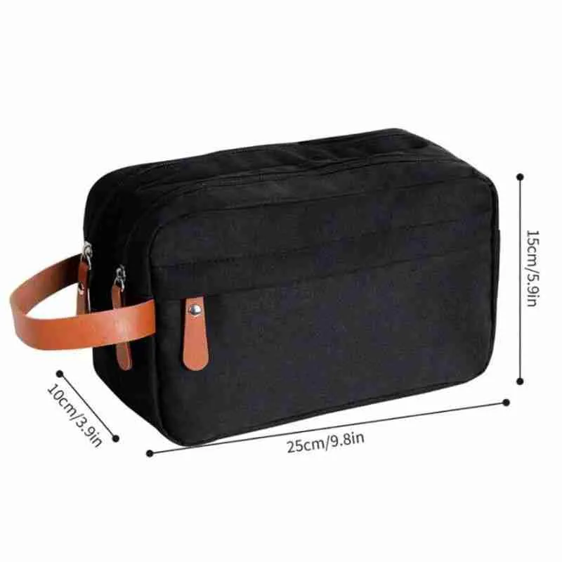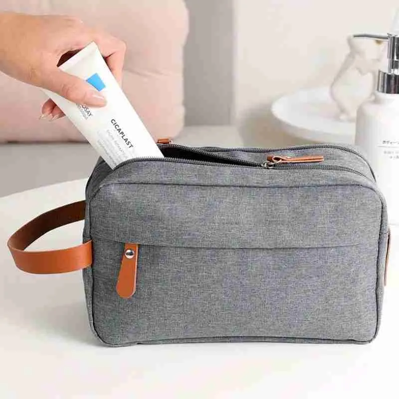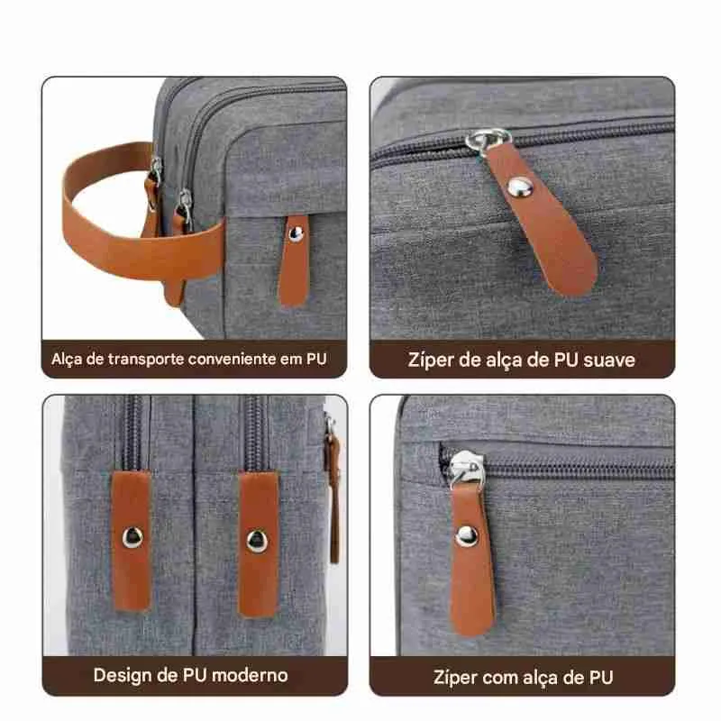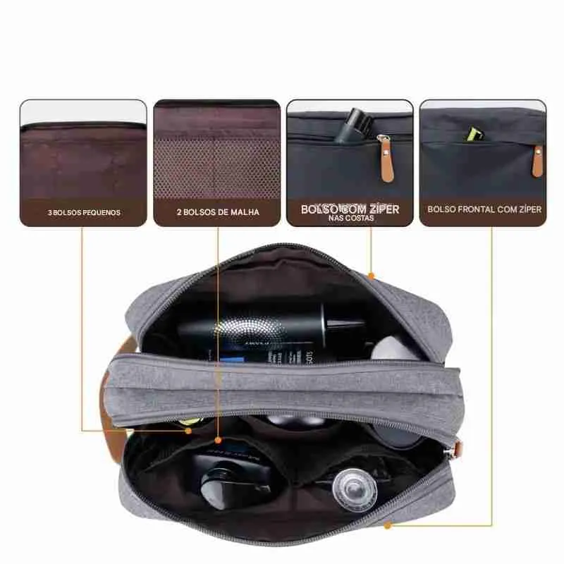 A necessaire possui um design retangular e compacto, com dois compartimentos principais fechados por zíper, permitindo uma melhor organização dos itens. A alça lateral em couro sintético marrom facilita o transporte e adiciona um toque de estilo.