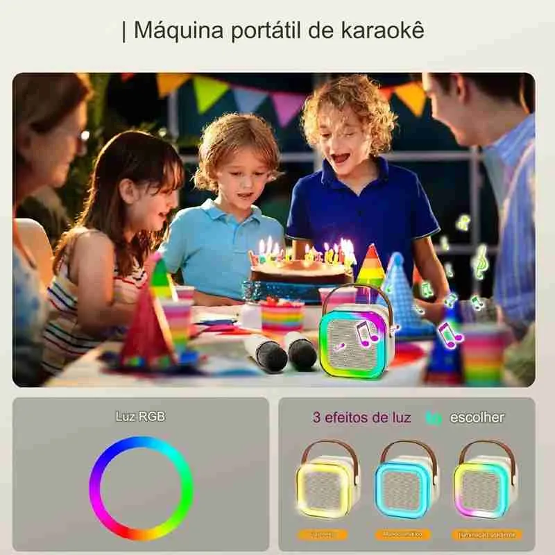 Vem com um microfone integrado, ideal para sessões de karaokê, apresentações ou simplesmente para amplificar a voz durante eventos.