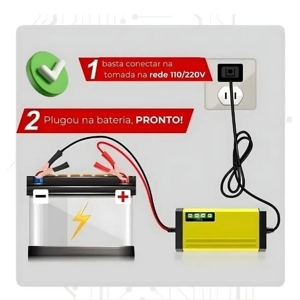 Antes de tudo, o carregador identifica o nível da bateria e ajusta a carga de forma inteligente. Dessa forma, ele preserva a vida útil da bateria. Além disso, o visor LED permite acompanhar o processo em tempo real. Portanto, o controle se torna simples, rápido e confiável em qualquer situação.