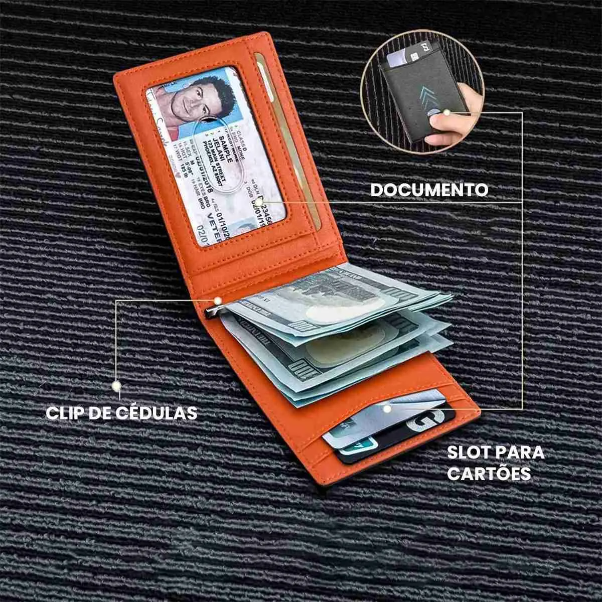 Organização Inteligente: Armazena até 6 cartões, cédulas e documentos com praticidade.