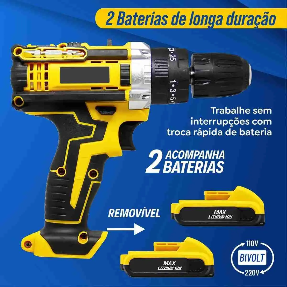 – Diâmetro do mandril 3/8” 10mm (aperto rápido).