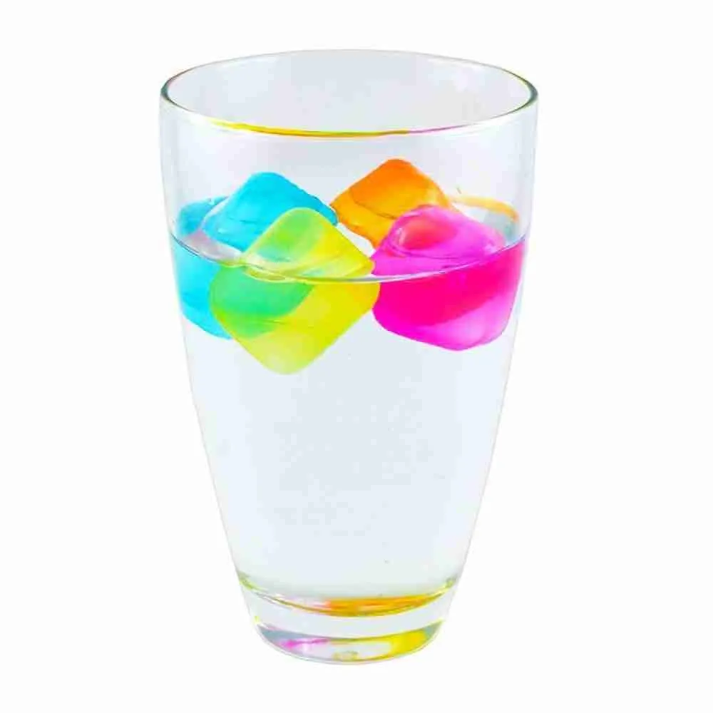 São 10 quadradinhos de cores sortidas para além de gelar, decorar sua bebida. O Gelo Artificial Cubes é desenvolvido em plástico, precisa apenas ir ao congelador por aproximadamente 12 horas e pode ser reutilizado quantas vezes você quiser.