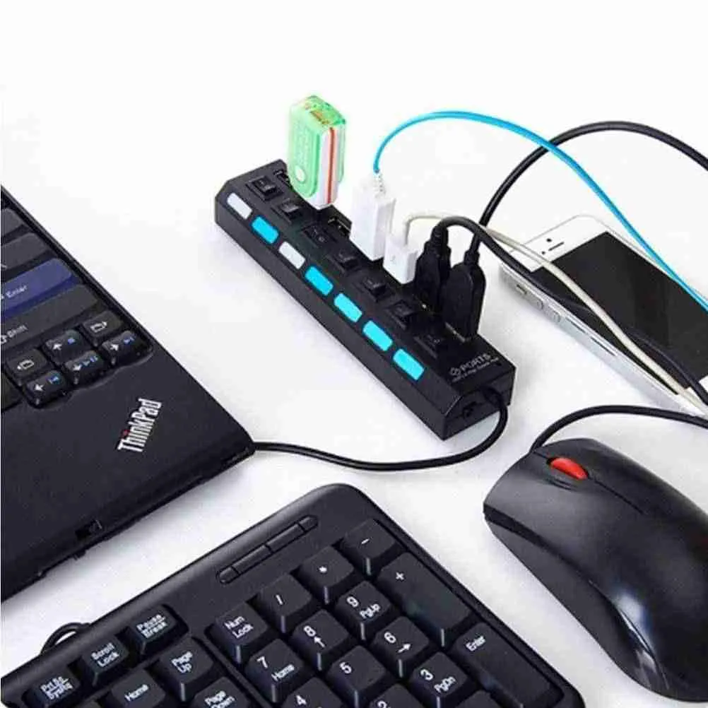 Como os computadores vendidos atualmente contam com um número limitado dessas portas, e cada vez mais temos dispositivos que se conectam aos computadores por entradas USB, é necessário ter em mãos um instrumento que facilite a conectividade de vários dispositivos em uma única porta USB. O hub é feito em material resistente, possui sete entradas USB, sete indicadores de LED e sete interruptores.