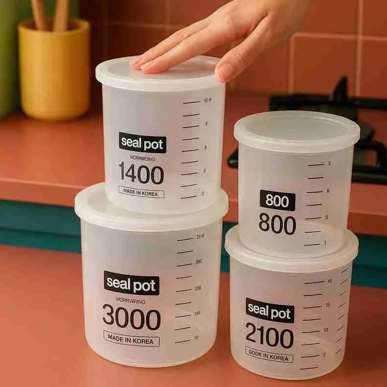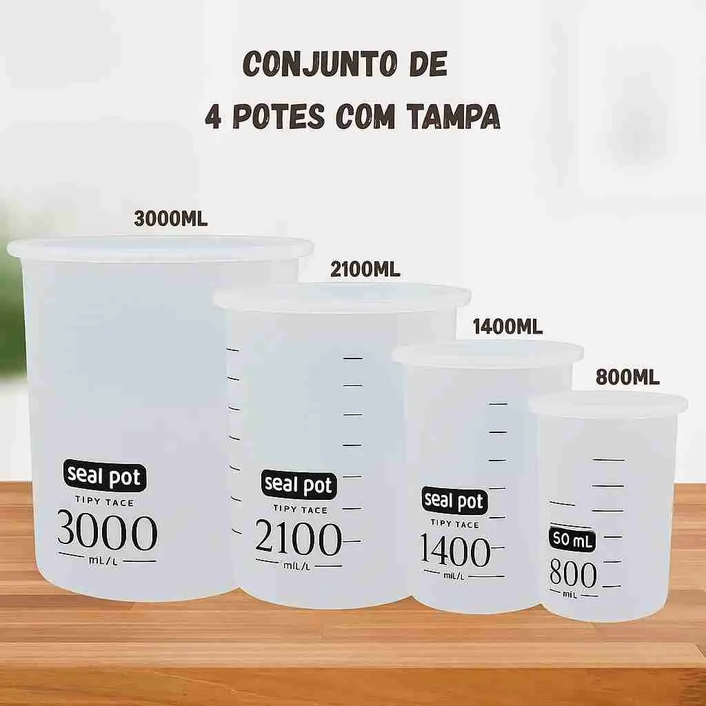 O Kit 4 com Potes Herméticos Empilháveis Plástico e Dosador mantém seus alimentos frescos por muito mais tempo. Fabricados com acrílico livre de BPA, esses potes são a solução ideal para quem busca praticidade e organização na cozinha.