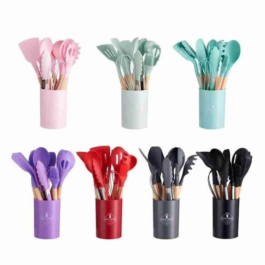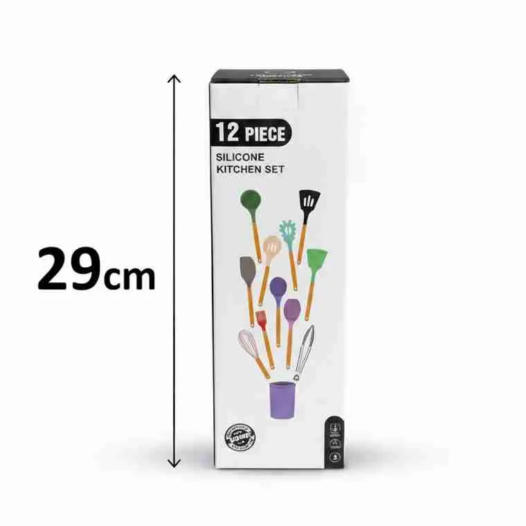 Kit C/12 Utensílios De Cozinha Silicone Cabo Madeira