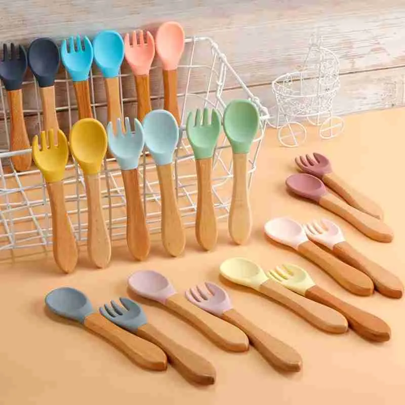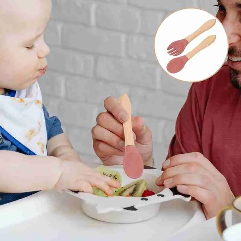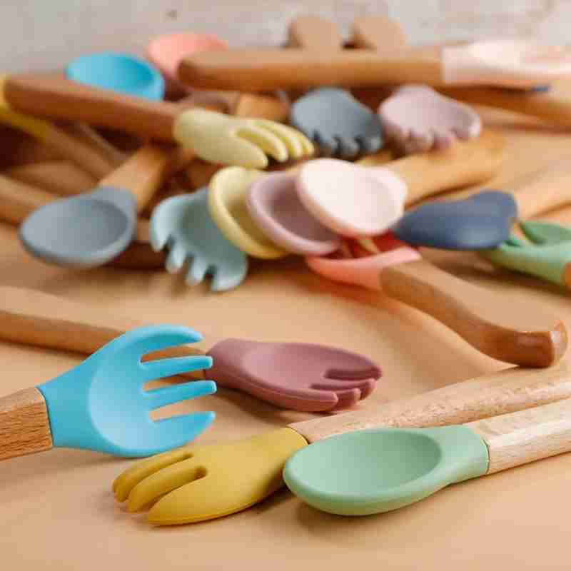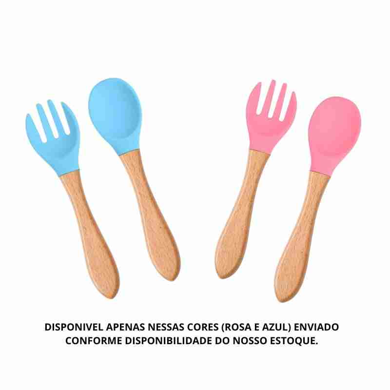 Kit Garfo + Colher De Silicone Cabo De Madeira Para Bebê