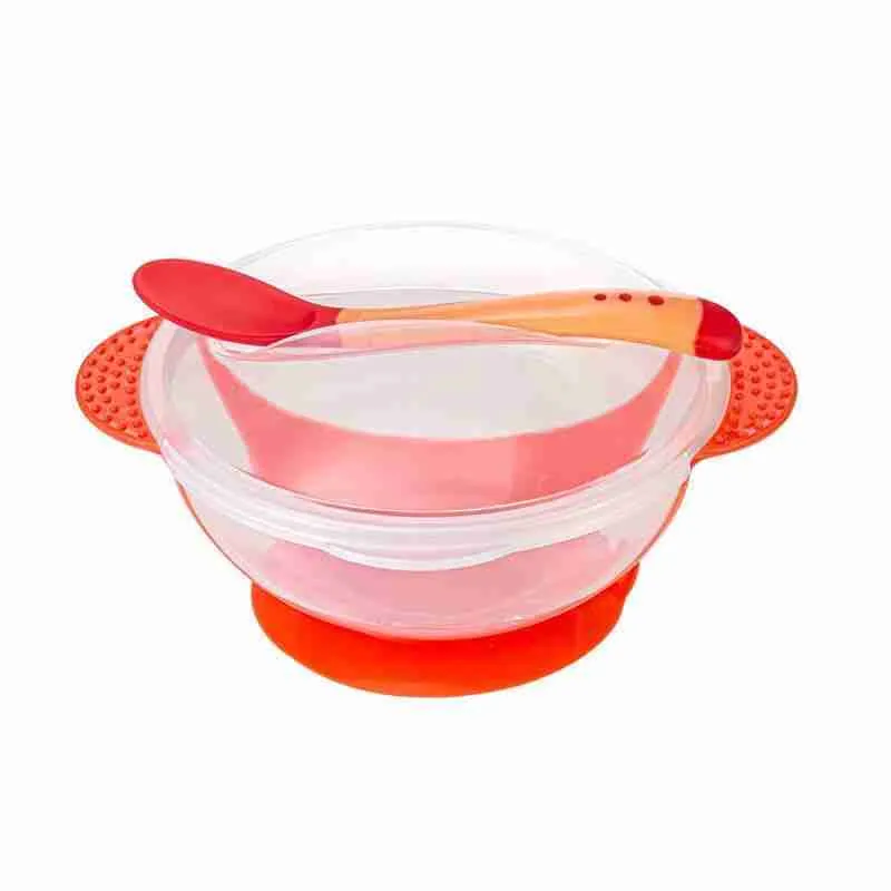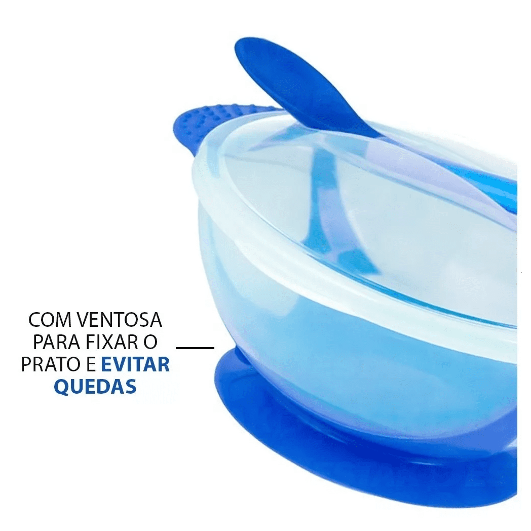 O Kit Refeição com Colher foi desenvolvido para facilitar o momento da alimentação do bebê. O prato fundo vem com ventosa para fixar na mesa, impedindo que o bebê o derrube durante a refeição. Além disso, a tampa tem um design especial para acondicionar a colher, podendo ser guardado ou transportado em passeios ou viagens de forma mais higiênica.