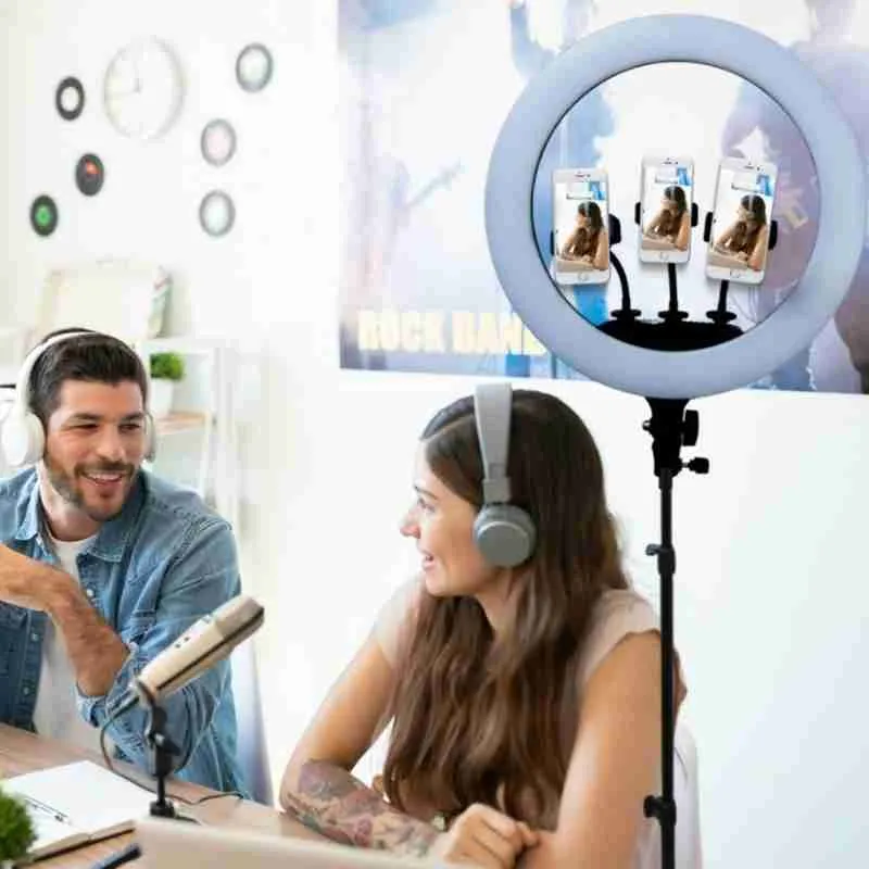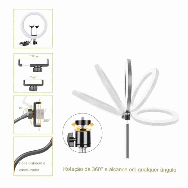 Apresenta 3 suportes para smartphones, o que permite o uso deles sendo um em cada plataforma de transmissão ao vivo.