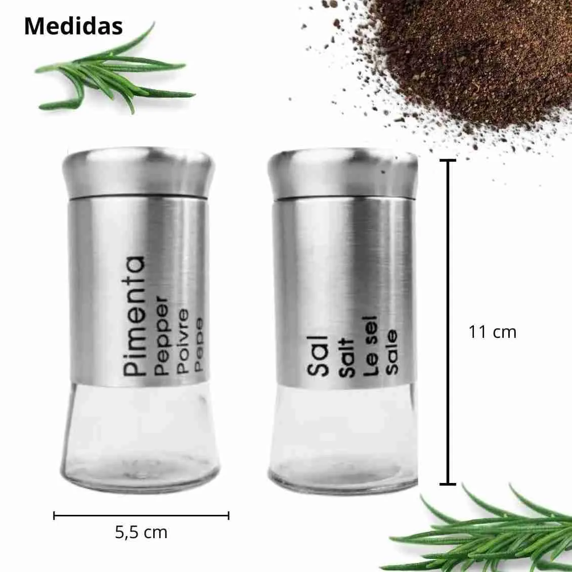 O Kit Saleiro e Pimenteiro de porta condimentos é confeccionado em vidro e em aço inox resistente e brilhante, além de contar com tampas também em inox, que garantem que o alimento fique sempre fresco, livre de sujeiras e poeira. Conta com peneira de silicone maleável que facilita a dosagem, evita desperdícios e não entope.