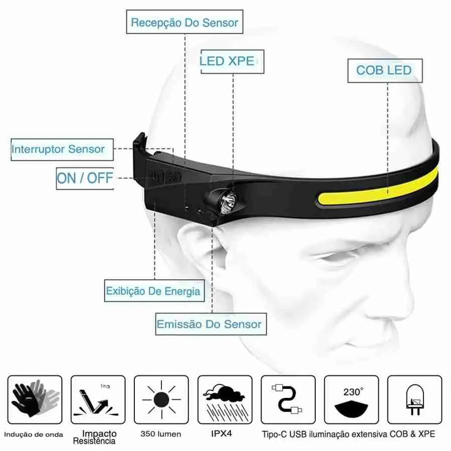 Lanterna De Cabeça Led Recarregável Fita Ajustável USB