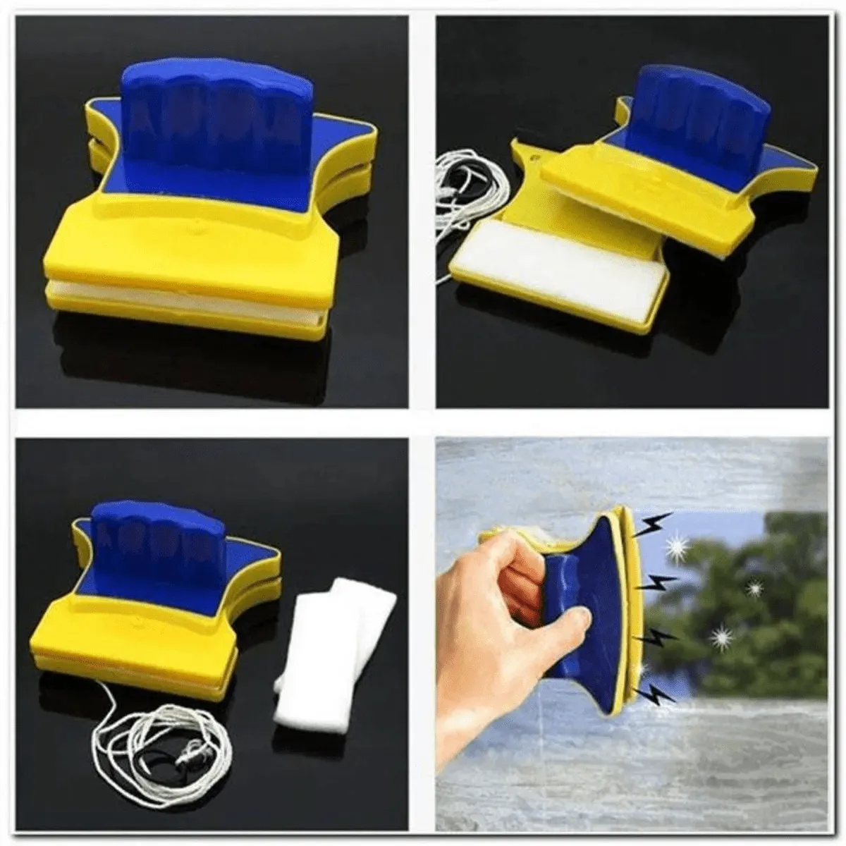 O Rodo Limpador Magnético de Vidros possui um super ímã que segura a face externa na janela e também possui dois feltro esponjas para molhar e colocar sabão ou detergente líquido.