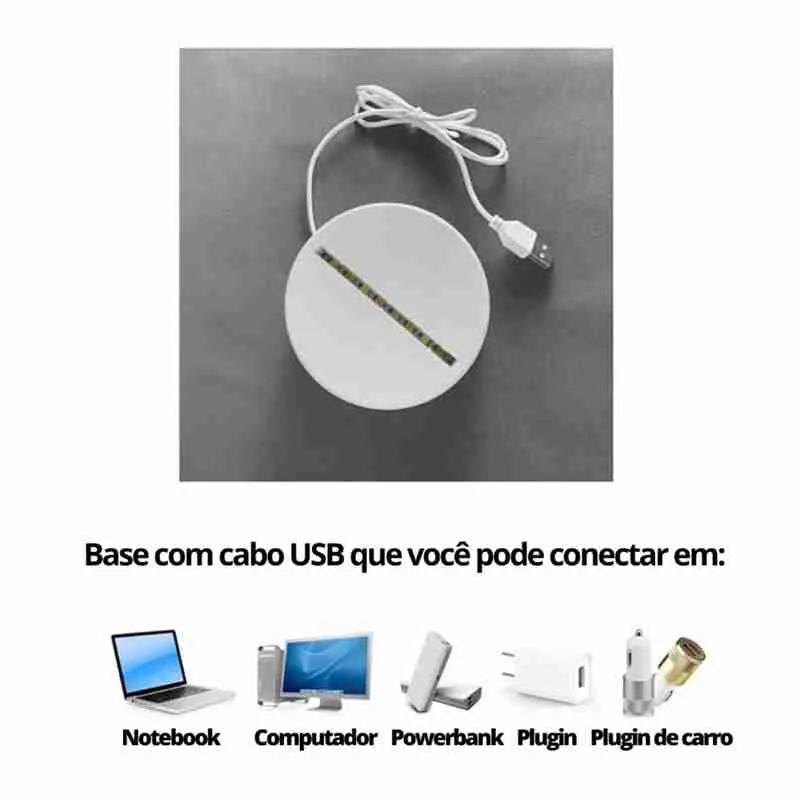 OBS: Os itens são enviados desmontados, ao receber, encaixe a peça de acrílico na base e conecte o cabo para ligar a luminária. Não acompanha a fonte de energia. O Cabo UBS que acompanha o produto, pode ser plugado em qualquer fonte de energia ou qualquer porta USB.