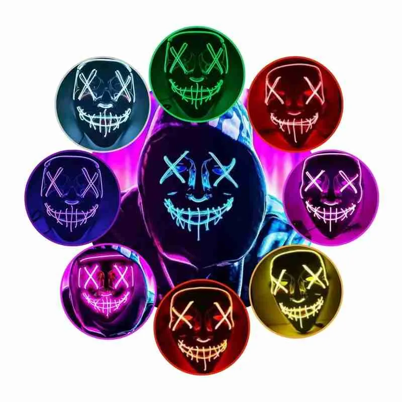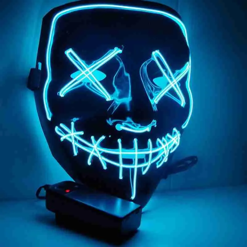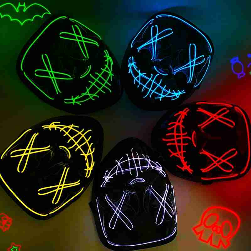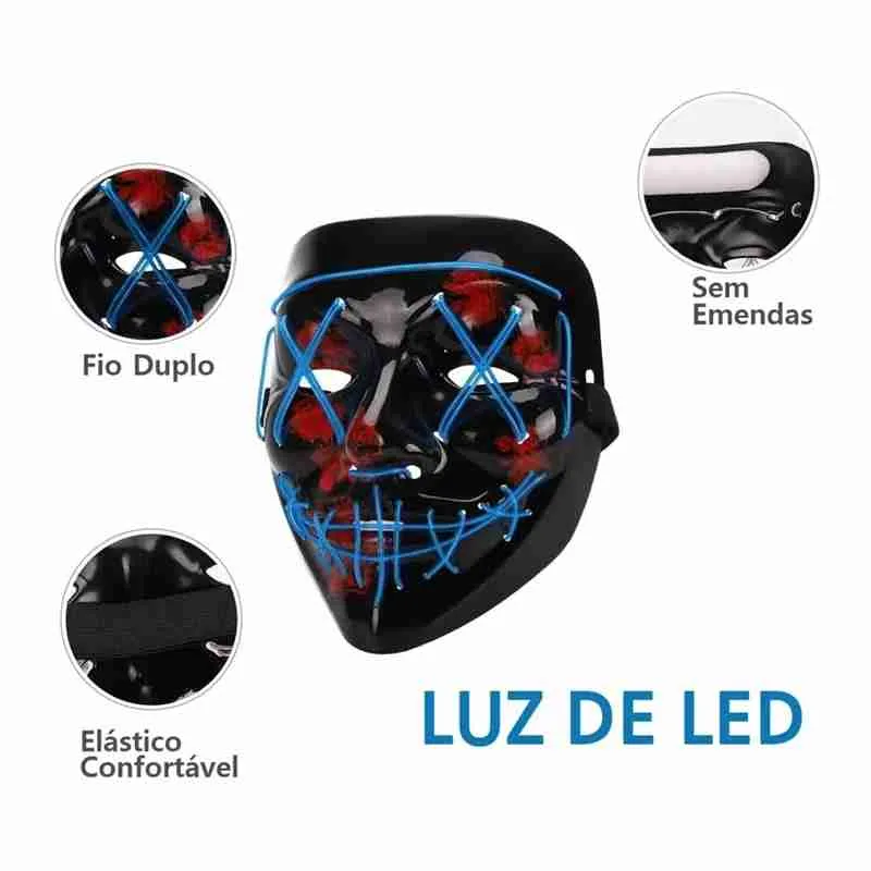 A máscara possui luzes de LED embutidas, em estilo neon que proporciona uma aparência vibrante e futurista fabricada com material flexível e durável, a máscara LED Neon é confortável de usar