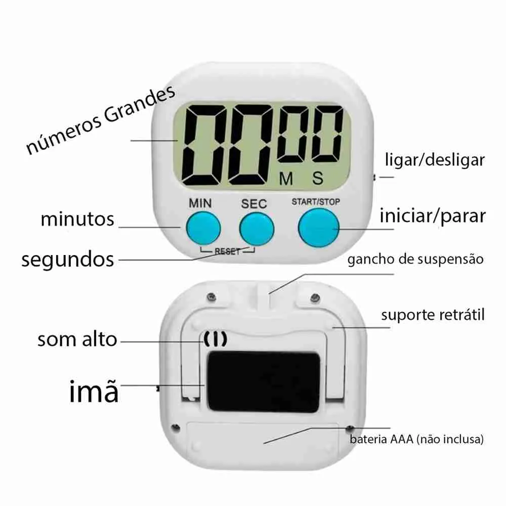 Este temporizador digital tem tela de LCD com grandes dígitos com alarme sonoro alto e com cronometro regressivo e também progressivo.