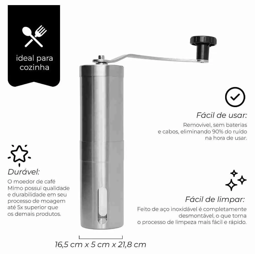 Moa os grãos manualmente, sinta o aroma fresco do seu café diário ao prepará-lo e possui recipiente com um visor para verificar a quantidade.