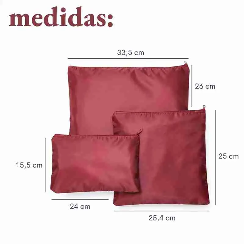 Sendo 3 unidades com ala para transporte, zíperes, pegadores e parte frontal com malha de nylon e possui também 3 unidades de nécessaires em nylon inteiramente lisas e impermeáveis.
