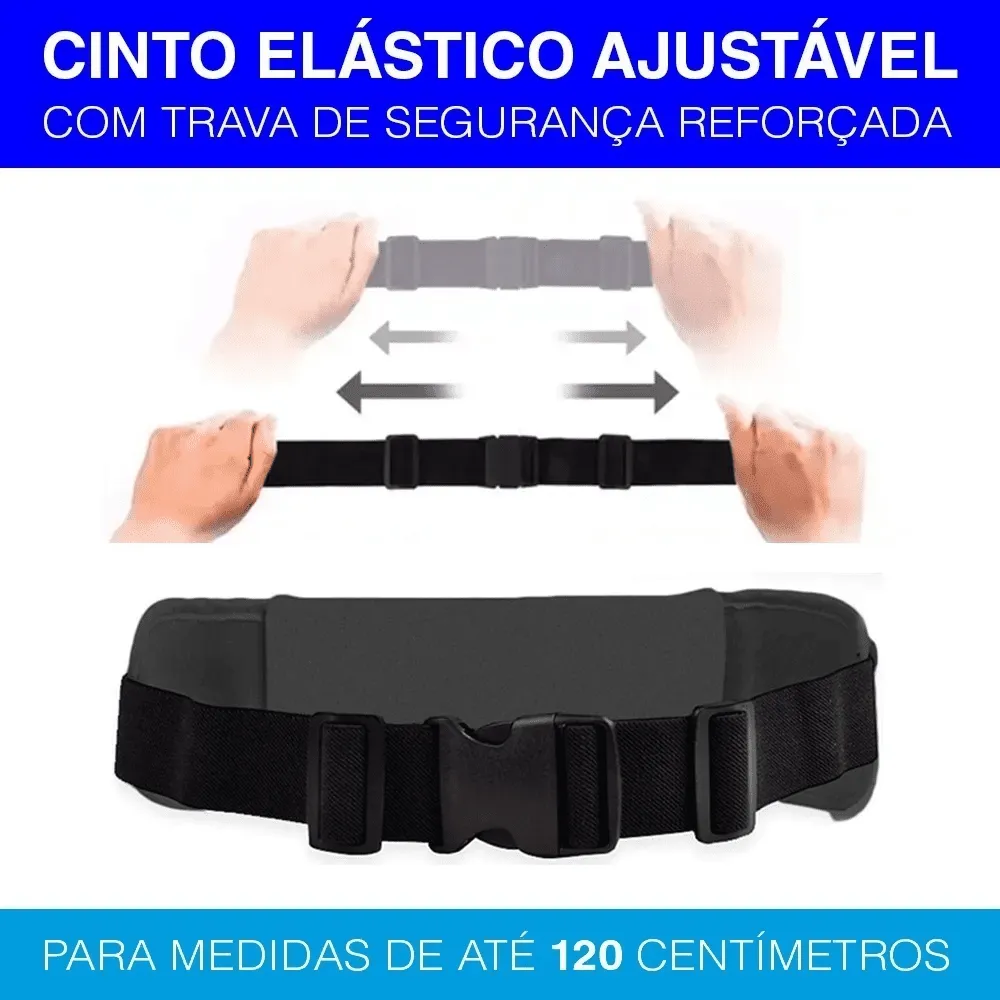 Alça elástica ajustável, tanto para cinturas mais finas, até as mais grossas, deixando a pochete bem junto ao corpo, sem ficar balançando e incomodando os movimentos, na prática esportiva. Recomendamos para cinturas de no máximo 120 cm. de diâmetro.