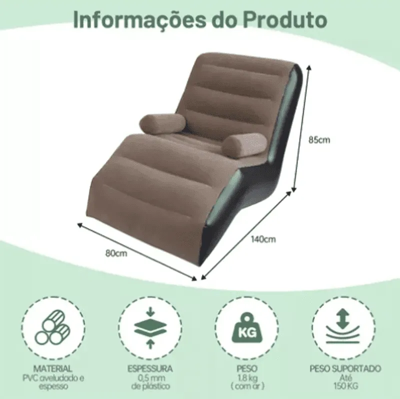 O Sofá Inflável Portátil Com Apoio De Braços conta com design ergonômico: Seu ângulo é reclinável em 120°, os lados do braço possui ajuste aerodinâmico.