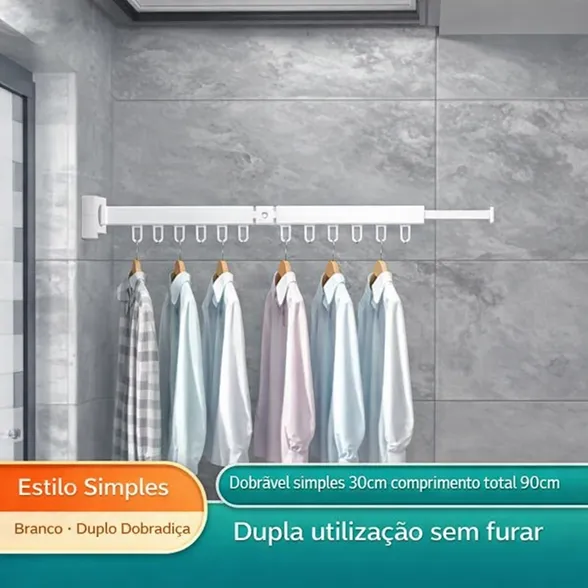 Varal de Parede Dobrável com Suporte para Cabides Lavanderia e Varanda