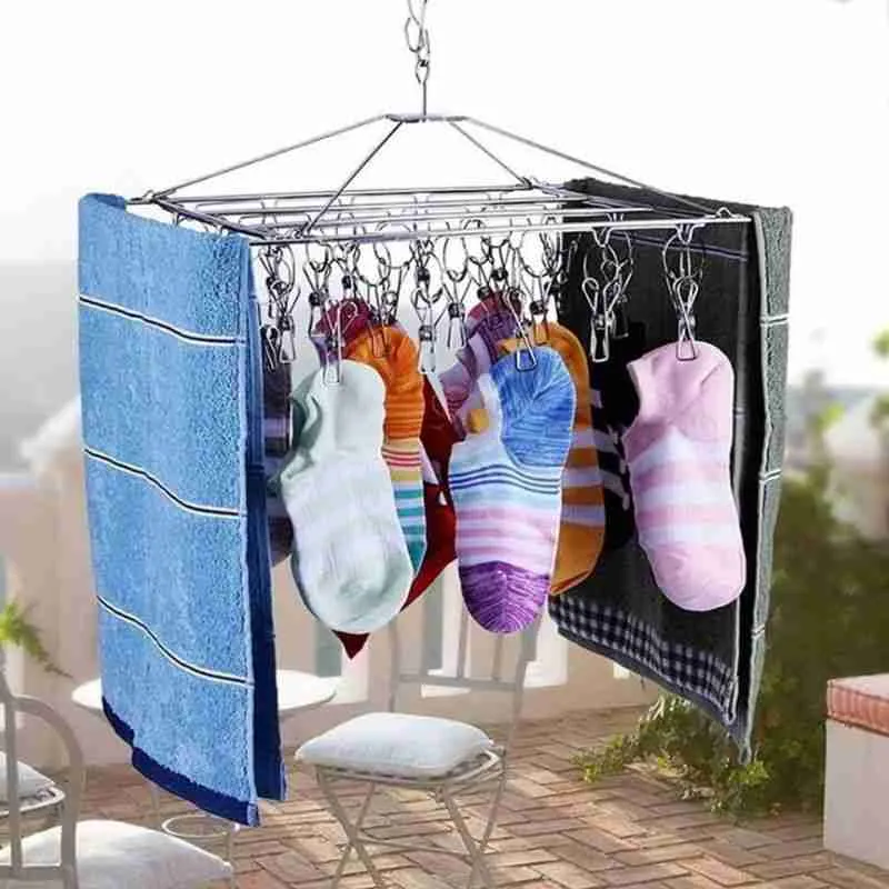 Gancho giratório: Permite pendurar em diversos suportes, como varais, cabides, portas ou barras.