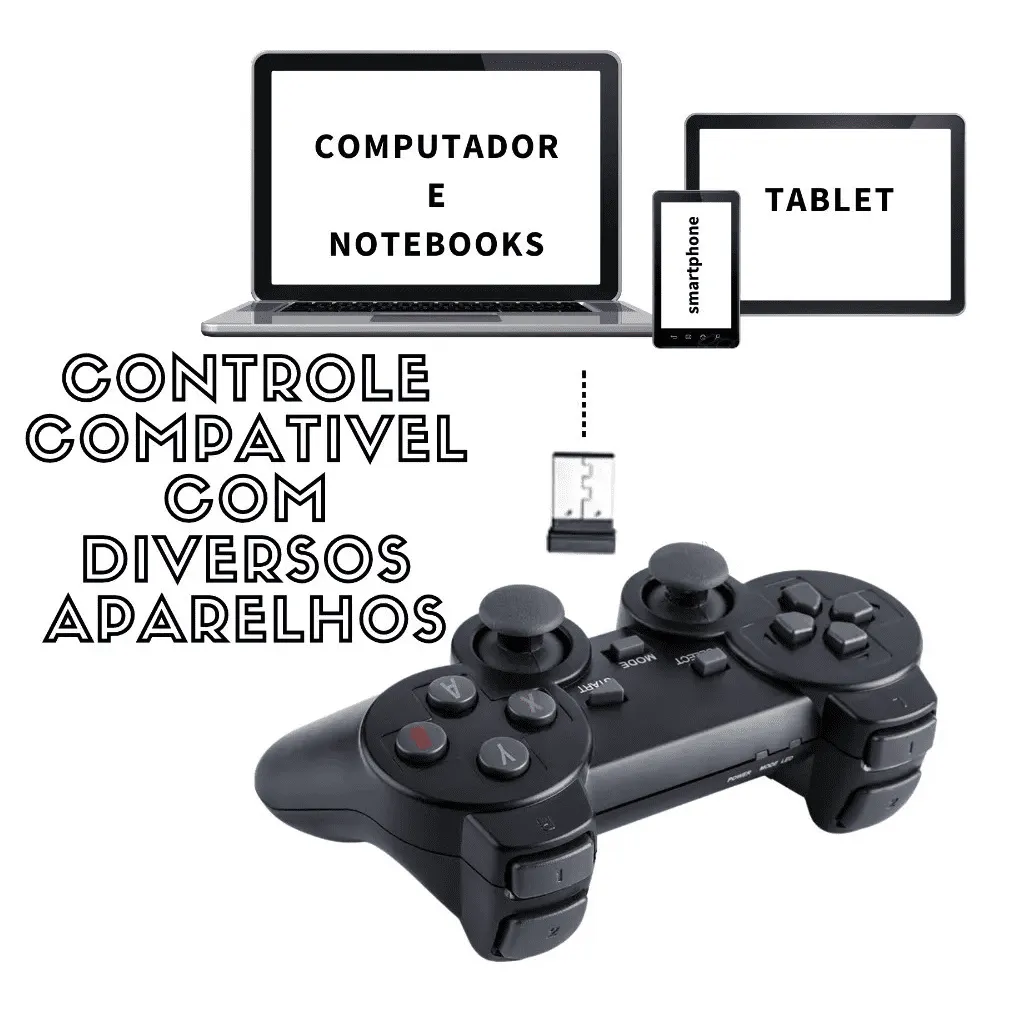 Acompanha o videogame / emulador dois controles sem fio com alcance de ate 10 metros.